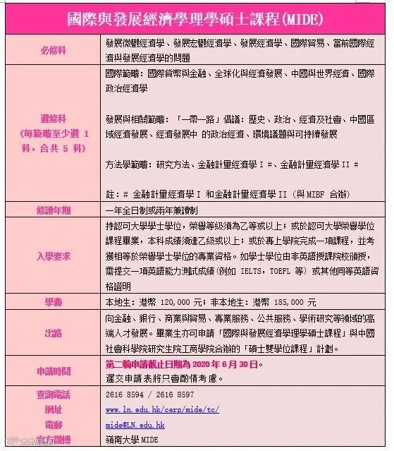 岭南大学经济学系与潘苏通沪港经济政策研究所、中国经济研究部于2018年联合创办「国际与发展经济学理学硕士」课程(Master of Science in International and Development Economics, 简称MIDE),为香港首个专注于「一带一路」倡议与经济发展(特别是湾区经济发展),并以中文(普通话)为主要授课语言的修课式研究生课程。