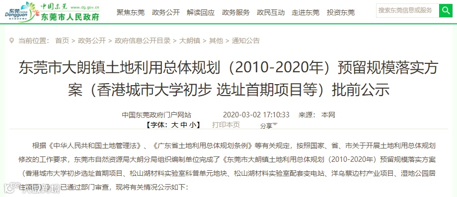 东莞市自然资源局大朗分局日前发布《东莞市大朗镇土地利用总体规划(2010-2020年)预留规模落实方案(