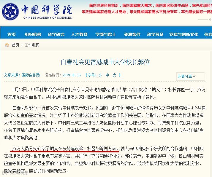 。当时中科院一篇稿件提及,中国科学院院长白春礼会见了香港城市大学校长郭位是,“双方人员分别介绍了香港城市大学在东莞建设第二校区的筹划方案……”
