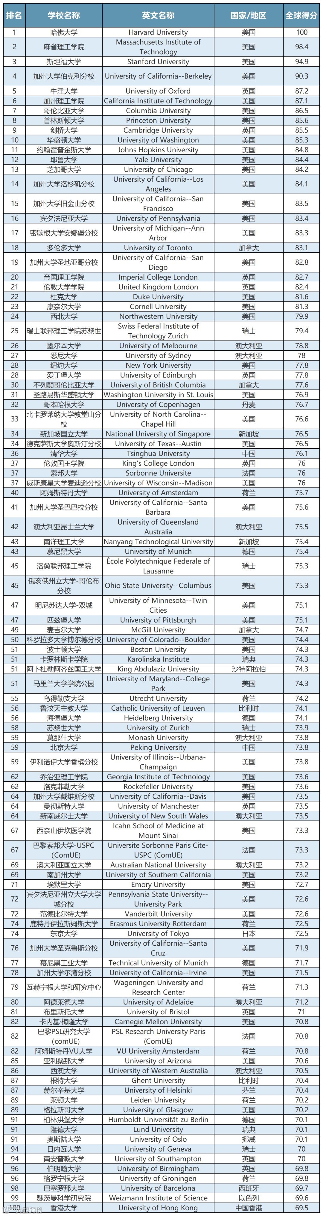 英校方面,牛津大学进入前五名,剑桥大学则名列第九。