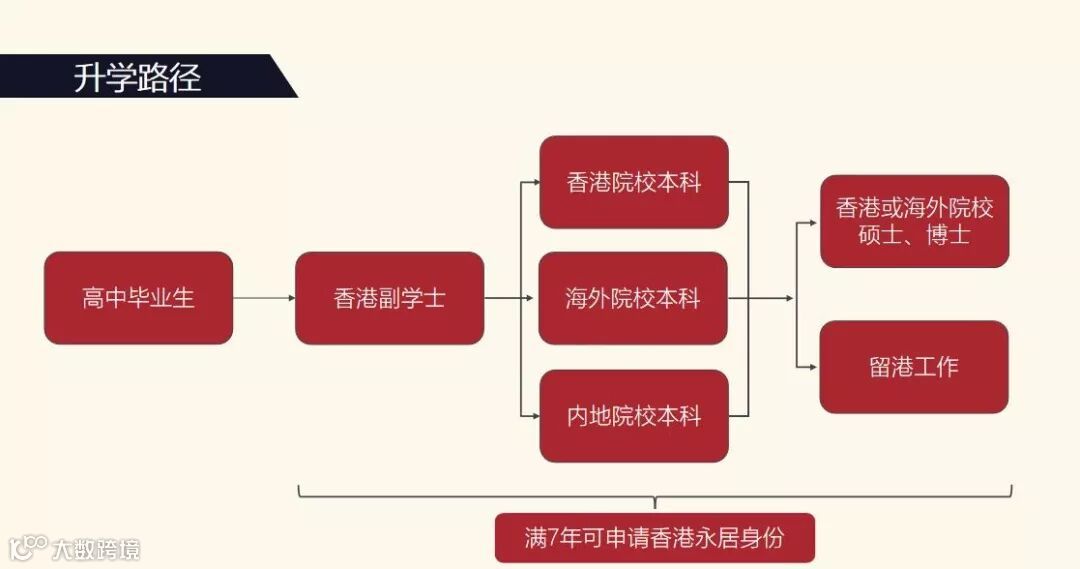相关学术期刊上的数据显示:目前,副学士学位课程已经成为香港学生晋升本科的主要途径之一。以香港大学专业进修学院为例,选择升学的学生中升读港大的比率为18% ,升读香港本地大学为 41% ,升读海外大学的为29%。