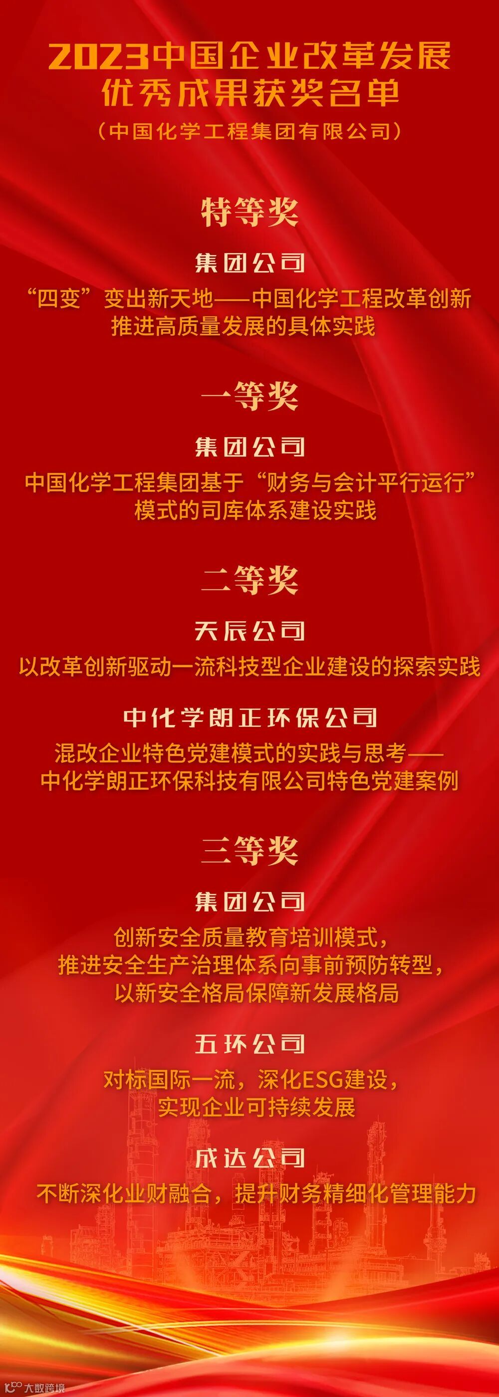 近日,中国企业改革与发展研究会组织开展的“2023中国企业改革发展优秀成果”评选结果正式公布。中国化学推荐参评7项改革成果成功入选,其中特等奖1项、一等奖1项、二等奖2项、三等奖3项。本届成果将分类汇编于《中国企业改革发展优秀成果2023(第七届)》及研究会年度权威报告产品《中国企业改革发展2023蓝皮书》。
