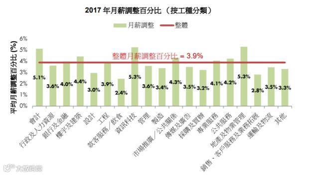 《2017年薪酬调查报告》显示香港雇员2017年平均获加薪3.9%,较2016年的3.6%略为上升,但仍显着低于2015年的4.7%以及2014年的5.9%。jobsDB(求职网站)香港总经理饶志文在当日发布会上表示,据特区政府预测,2017年香港约有2%至3%经济增长,相信香港雇员薪酬也随之略为上调,至于下季市场表现,则取决于下半年度全球经济活动。