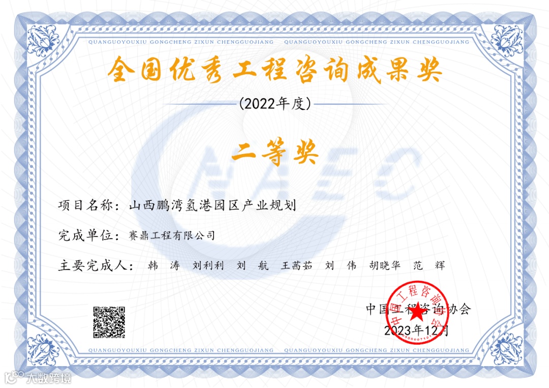 近日,全国优秀工程咨询成果出炉,由中国化学赛鼎公司负责编制的《山西鹏湾氢港园区产业规划》荣获全国优秀工程咨询成果二等奖。