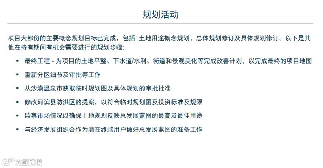预计3年以后可完善详细规划,按照房价18%左右出手给当地开发商。5年可以完全退出。