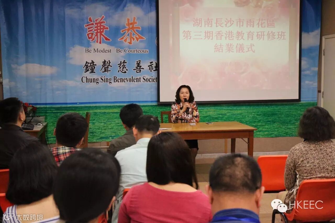 同时,5月26日,是雨花区第三期香港教育研修班考察学习的最后一天,结业仪式在钟声慈善社胡陈金枝中学的会议室隆重举行。结业典礼上,王清华副区长为全体学员颁发了结业证书并为此行做了简单扼要的总结。她首先肯定了雨花教育赴港考察之旅内容的丰富多彩,认为这次活动组织得既严肃紧张,又生动活泼。还现场分享了长塘里小学杨媛媛副校长在微信平台发送的学习感悟,认为大家学习认真,感悟深刻,学有所得。同时,王区长提出学习是暂时的,交流是长远的,教育无疆。她提出了三个希望:一是加强互动,希望香港教育交流中心提供更多香港与内地学校的互动交流机会。二是深度交流,希望雨花区各校能真正与香港考察学校能牵手合作,能有更深层次地师资互动、学生互动,做到教育互通,共同发展。三是学以致用,希望考察团一行人员,能将所观、所学、所思和所想,带回雨花区,将学习精华运用于工作实践,为雨花教育添光彩,带动雨花教育新发展。