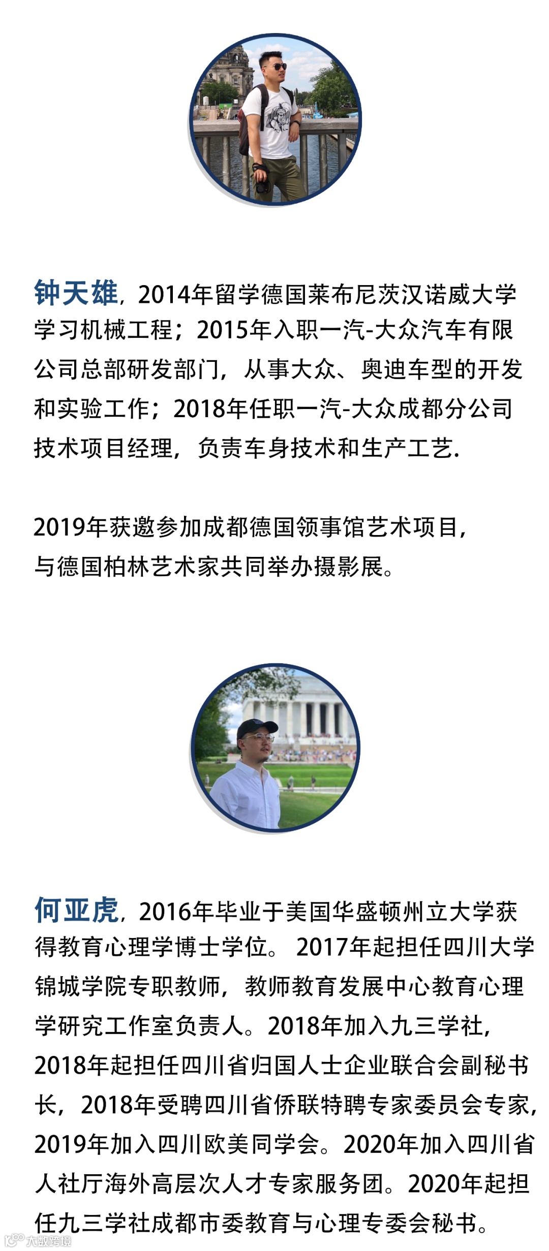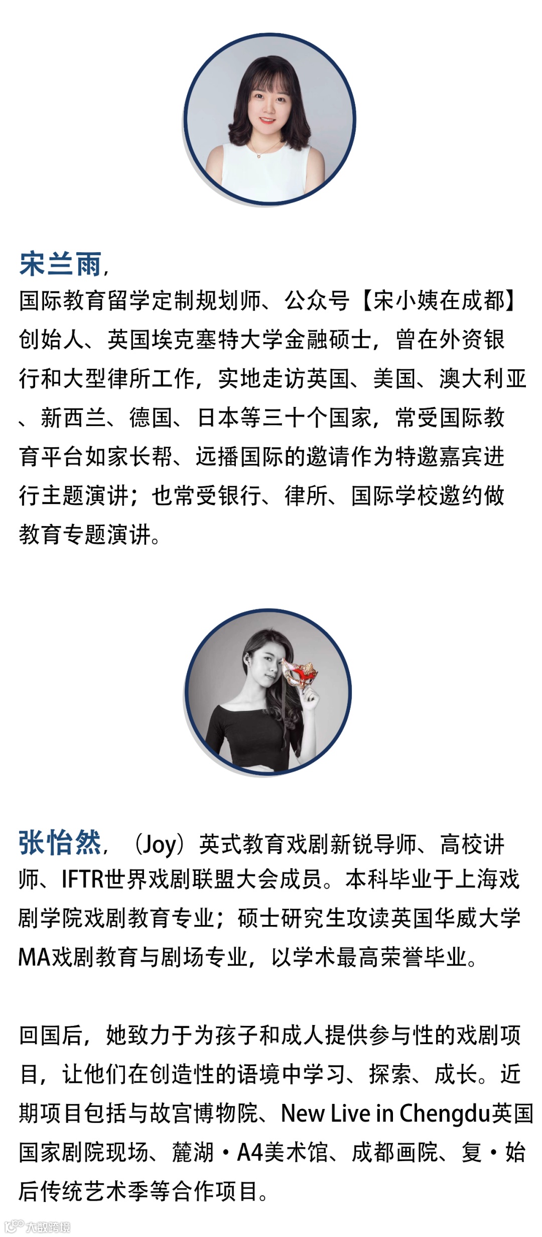 我们特别邀请了6位毕业于美国、欧洲不同院校、不同专业的归蓉校友,分别是建筑师、工程师、金融规划师、外籍人力资源专家、心理学博士、英式戏剧导师等。他们从不同的国家回来,又投身不同的行业。生活和职业多彩又有趣的他们将从不同的职场身份和角度为归蓉菁英们分享回国发展经验、 和就业及创业建议。