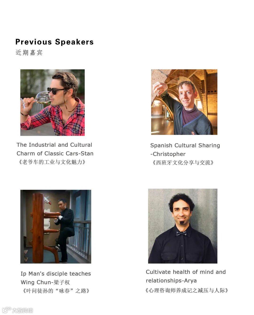 跨文化、金融、美食、功夫、咖啡、摄影、创业、即兴表演、数字媒体、Rap、心理学、古董车....我们邀请过超过10个国家的17位优秀青年嘉宾。