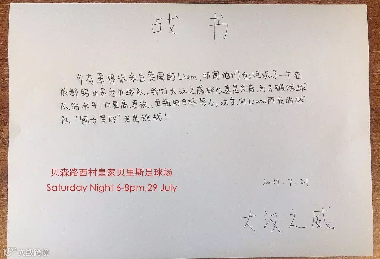 - We have heard that there is an Englishman in Chengdu who goes by the name of Liam... And he has a football team full of foreigners. We, the Great Han Chinese FC, challenge you to a MATCH! This Saturday night (29th July), 6 til 8pm. Be there. -