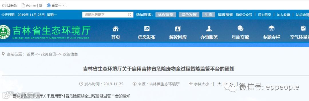 为进一步强化我省危险废物产生、收集、贮存、利用、处置全过程信息化管理,我厅组织建设了吉林省危险废物全过程智能监管平台,目前已具备使用条件,拟定于2019年12月1日起上线运行,现就有关事项通知如下: