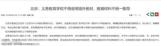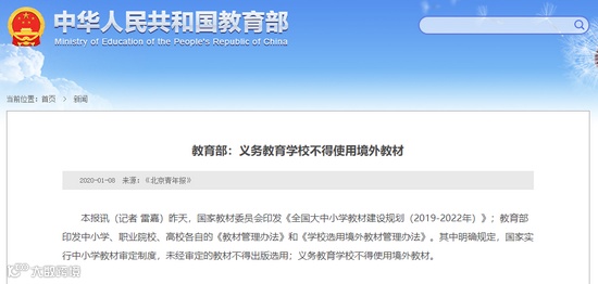 教育部官网在2020年1月,也再次发布了北京青年报的报道:《教育部:义务教育学校不得使用境外教材》。