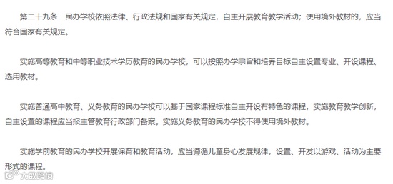 今年4月公布且将于9月1日实施的《中华人民共和国民办教育促进法实施条例》中明确指出,实施普通高中教育、义务教育的民办学校可以基于国家课程标准自主开设有特色的课程,实施教育教学创新,自主设置的课程应当报主管教育行政部门备案。实施义务教育的民办学校不得使用境外教材。