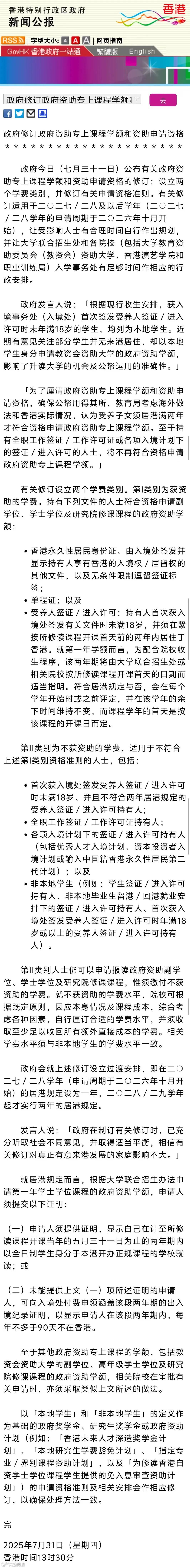 香港特别行政区政府昨日公布了一项关于政府资助专上课程(副学位、学士学位及研究院修课课程)学额及资助申请资格的重要修订。
