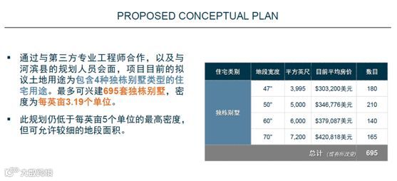 小结:217英亩折合88万平米、1300亩住宅用地、售价1650万美元(约1.15亿人民币);按照原计划可以建造532栋别墅;新的规划申请别墅增加到695套别墅,增加163套,