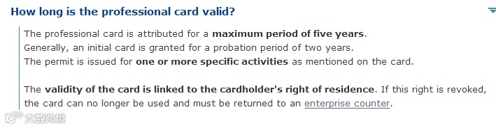 (中文解读: 职业卡(老板卡)最长5年, 如果少于5年, 可以延期至5年,到期后可以更新)