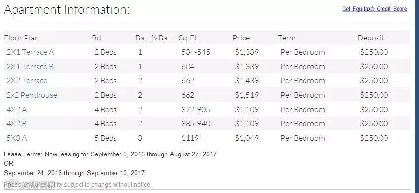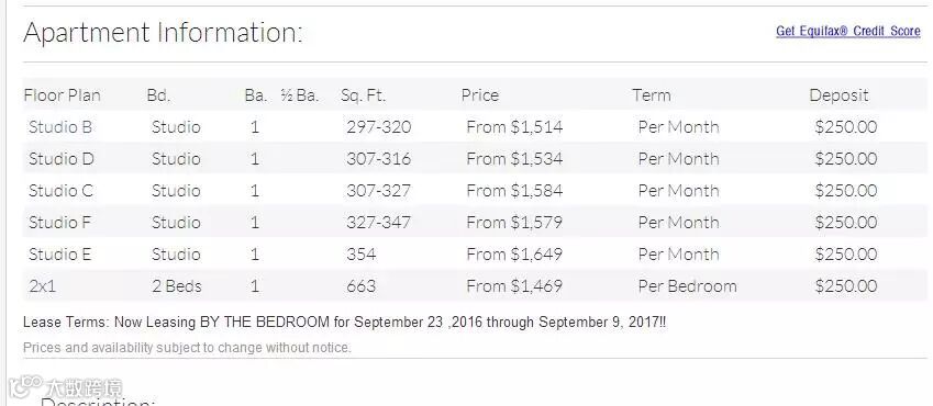 公寓最小的面积是297平尺,最低的出租每月1514.合每月每平尺是5.09美元;