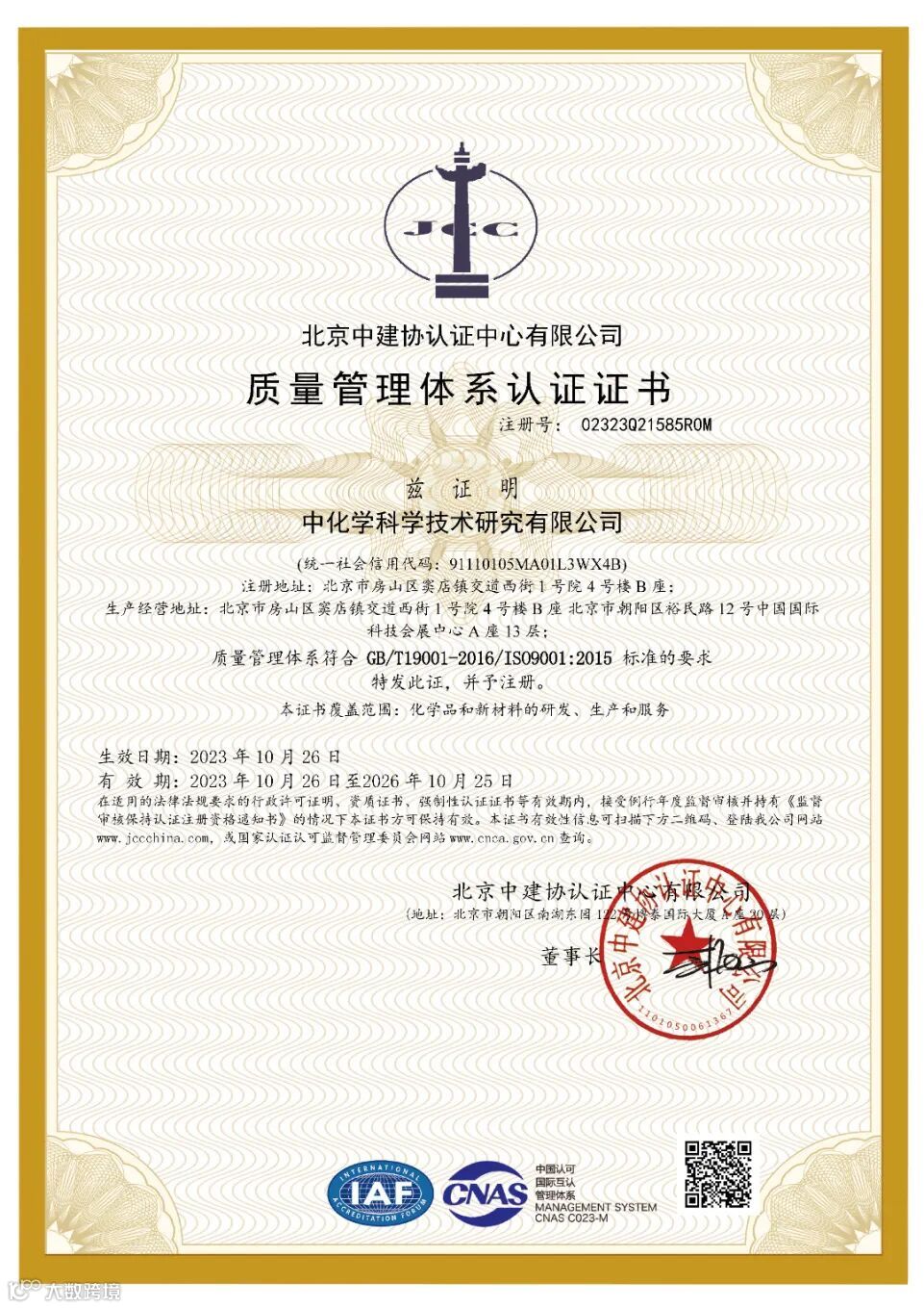 近日,科研院荣获ISO“三体系”(GB/T19001-2016/ISO9001:2015标准质量管理体系、GB/T24001-2016/ISO14001:2015标准环境管理体系、GB/T45001-2020/ISO45001:2018标准 职业健康安全管理体系”)认证证书。这是科研院在提升企业综合实力过程中取得的新进展,标志着其在精细化、制度化、规范化管理方面迈上新台阶。