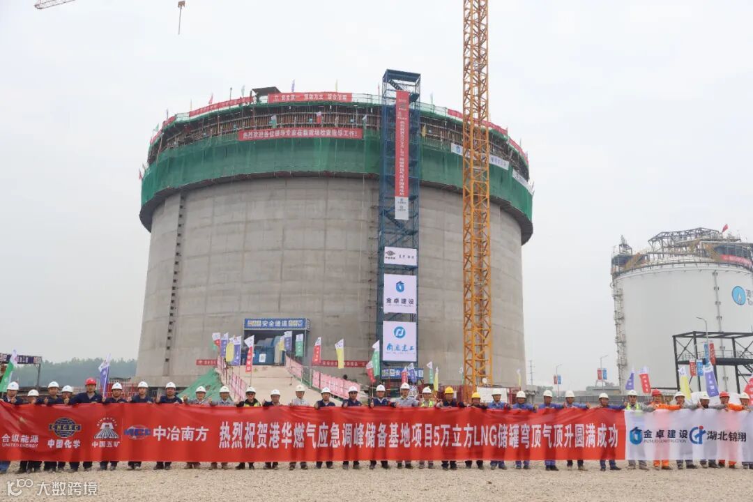 近日,由东华公司总承包的港华燃气应急调峰储配基地项目(一期二部分)5万方低温储罐穹顶气顶升工作顺利完成,为项目完工奠定了坚实基础。储罐拱顶重约330吨,拱顶结构跨度长约54.45米。大穹顶在鼓风机不间断作业下,顺利达到指定位置。