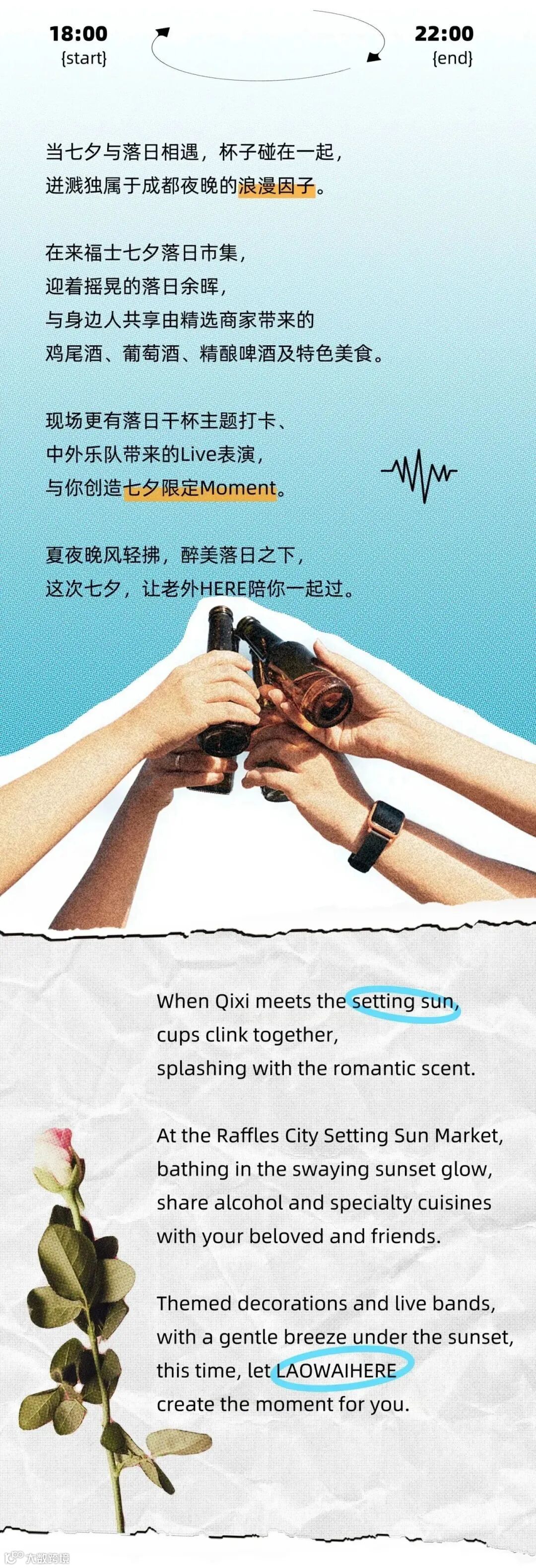 导读:七夕夜晚不设限,抛开定义,来和我们一起玩!This time, come and play together with alcohol, sunset and vendors in the Raffl
