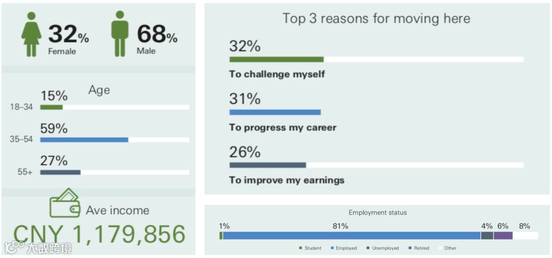汇丰银行(HSBC) 2017/18年度的“移居探索者调查”(Expat Explorer Survey)报告称,移居中国可以为移居者提供诸多职业和收入优势。在中国,超过一半的外籍人士任职于教育或制造业,他们的收入明显高于其他移居者——通常每年可多挣得7万美元。此外,据报道,同在母国生活相比,选择来中国的外籍人士可以获得更多存款和可支配收入。