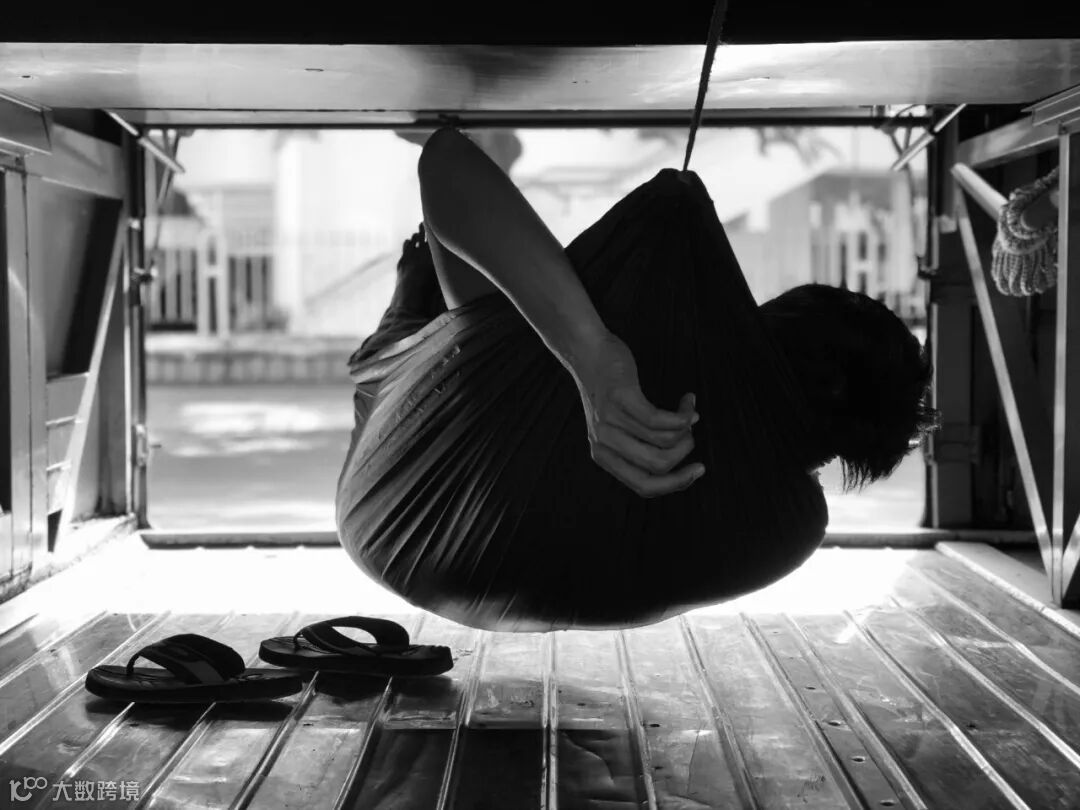 一位大巴司机在一张简陋的吊床上小憩,摄于越南芽庄