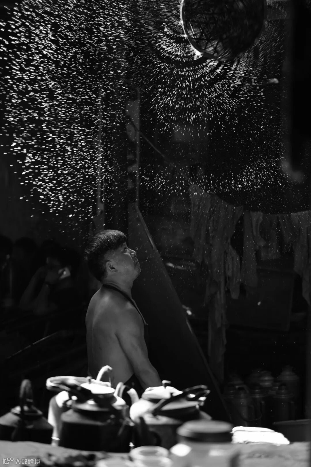 那天我们一起在成都的一个老茶馆度过了一个美好的早晨,还拍了一些照片。期间我看到一个服务员用一种特殊的方式弄去干茶盘,然后我做好拍摄的准备。那时太阳正在升起,阳光从窗户洒进来透过每一个水滴,这样每个水滴都呈现出不同的光感,最后我还是比较幸运地拍下了这张照片,虽然花费了一小段时间。