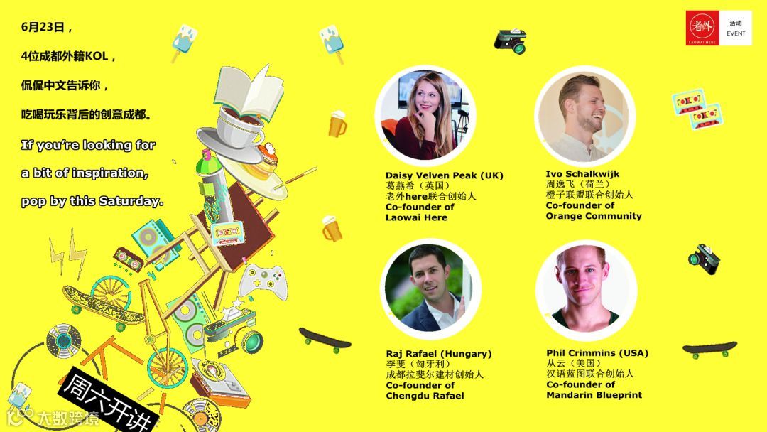 Daisy来自英国伦敦,毕业于英国诺丁汉大学,中国文学硕士,毕业后来到成都,创立了“老外HERE”。老外HERE是西南地区首家专注外籍人力资源,为外籍人才在华提供全方位工作生活服务的人力资源平台,同时他们有高频率在国内和海外举办一系列国际文化活动,推广中国文化和企业,吸引更多的外籍高层次人才来中国工作或创业。