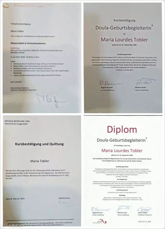 由瑞士doula协会(Doula Association of Switzerland)颁发的doula即母婴护理师专业职称证书