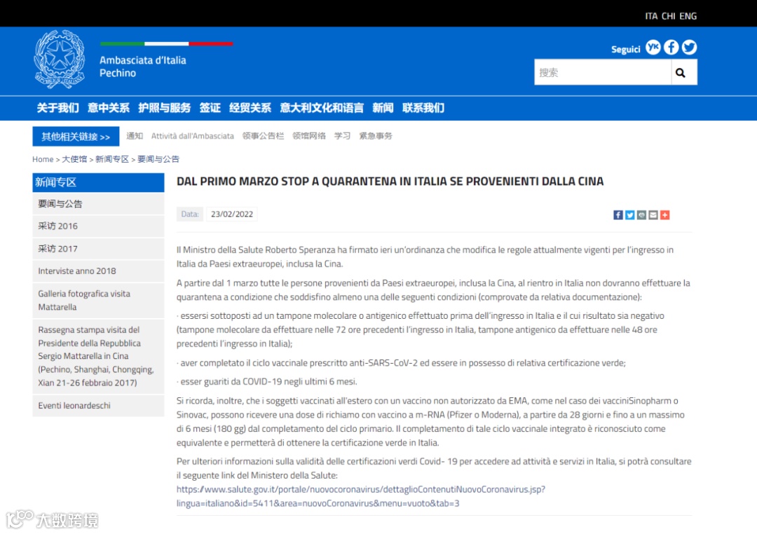 自3月1日起从中国前往意大利的人员无需进行隔离