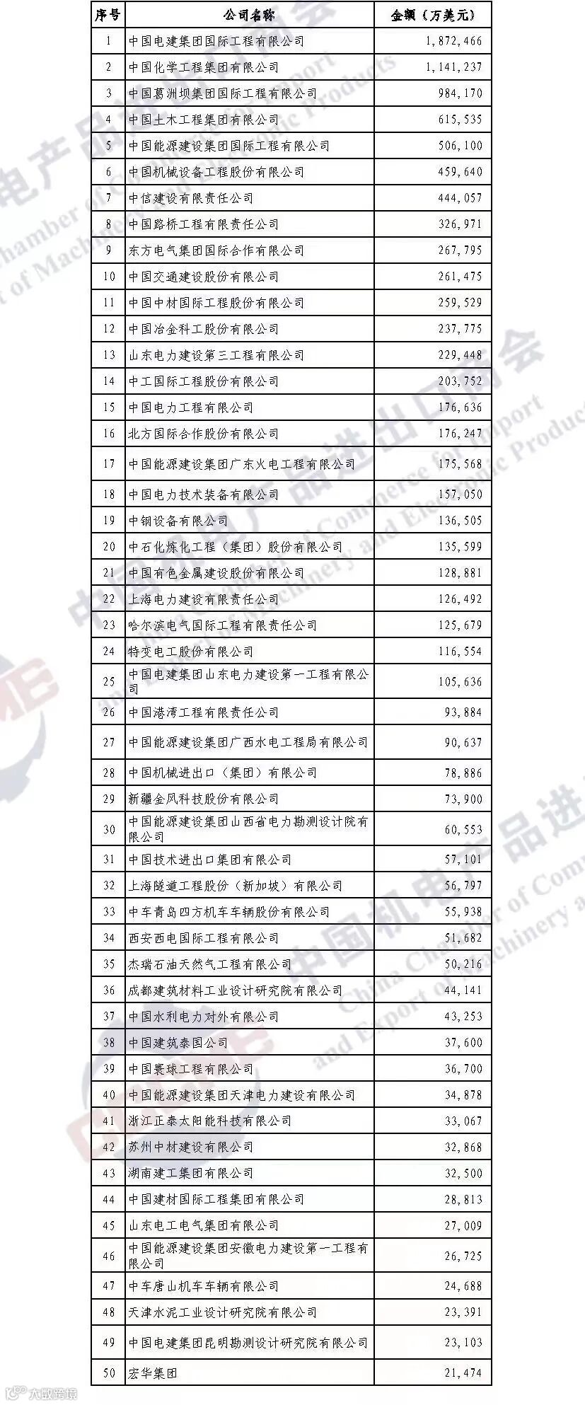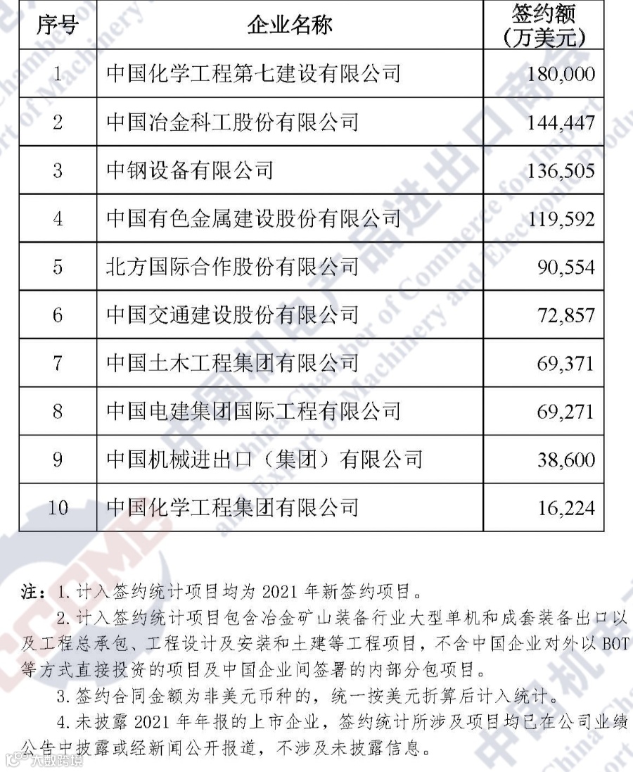 2月21日,中国机电产品进出口商会官方发布2021年中国企业境外大型成套设备工程项目签约以及轨道交通、石油化工、冶金矿山、建材水泥和水处理等重点行业企业排行榜。中国化学及所属七公司以优异成绩在多个榜单中站排头、打头阵,表现抢眼。