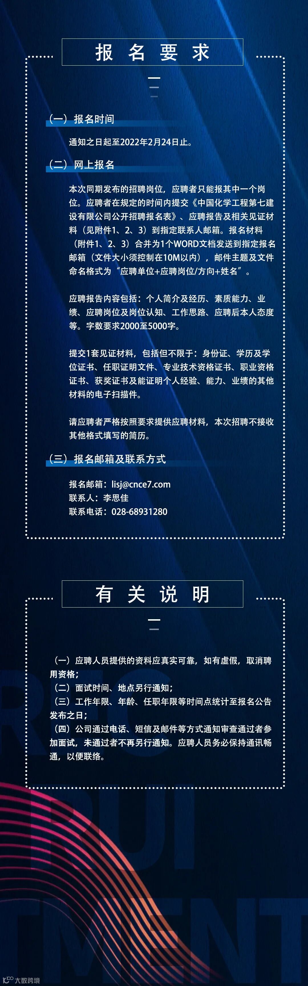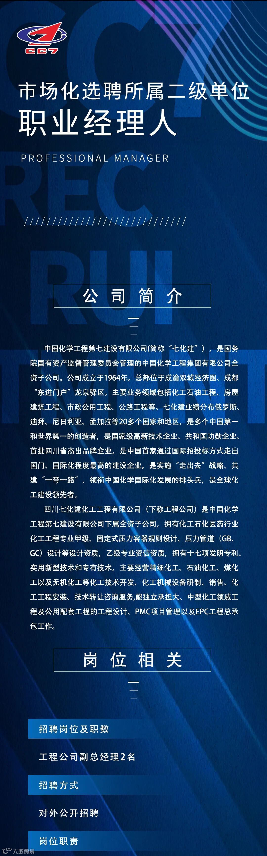 中国化学工程第七建设有限公司市场化选聘所属二级单位职业经理人公开招聘启事