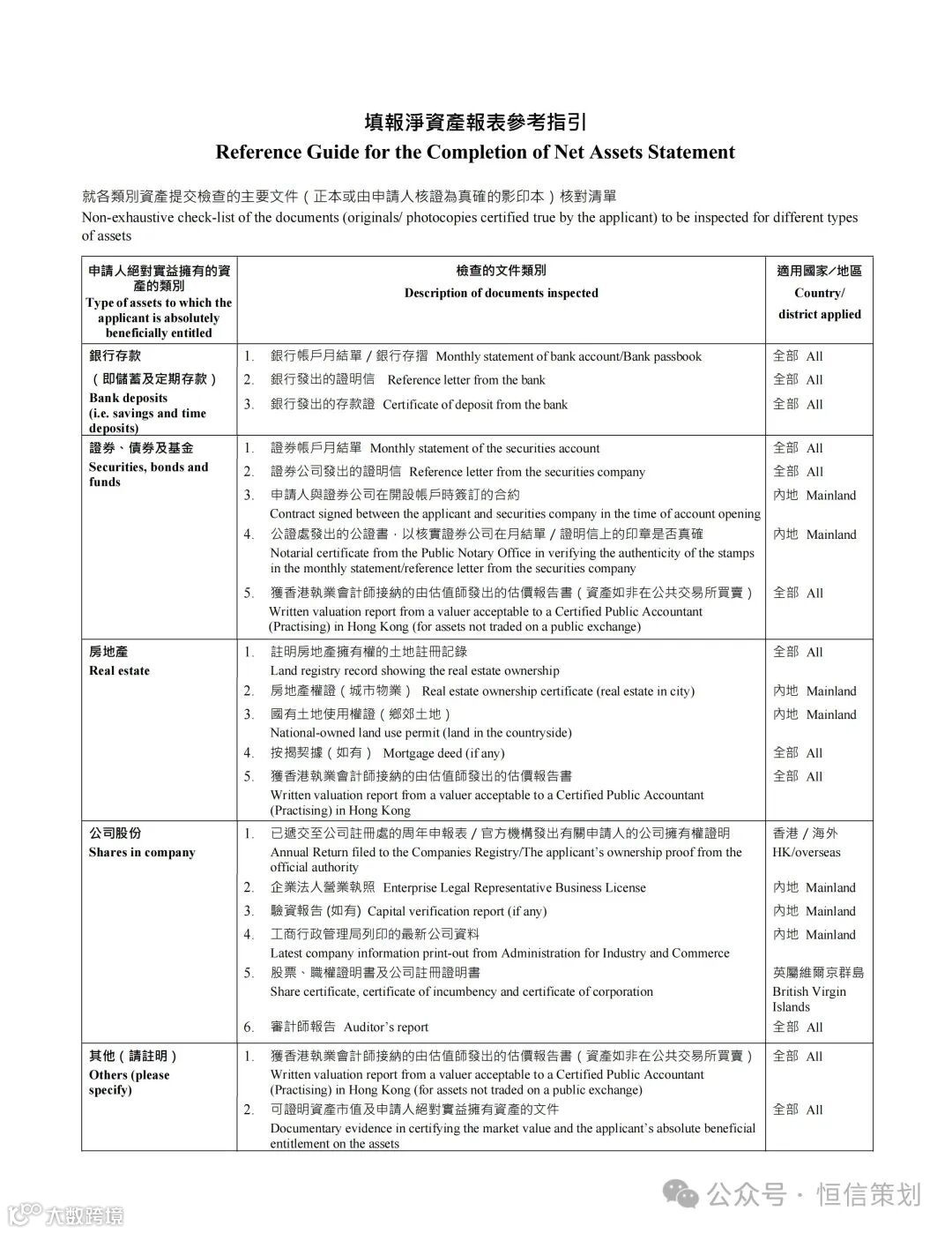 此外,投资推广署发布的《填报净资产报表参考指引》,详尽列出了针对各类资产所需提交以供核查的主要文件清单。