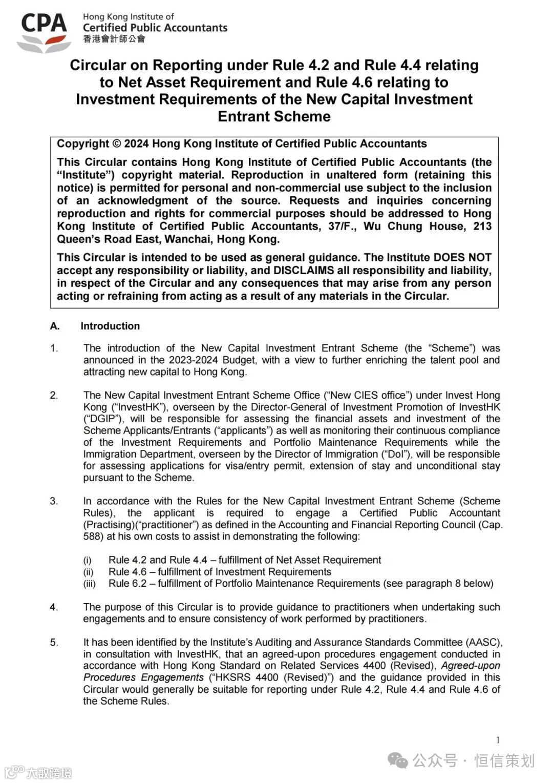 公会特此发布《关于根据新资本投资者入境计划规则4.2及4.4条有关净资产要求及规则4.6条有关投资要求的申报之通告》(以下简称“通告”),其中明确要求香港执业会计师须严格按照公会颁布的《香港相关服务准则》第4400号之规定,对财务信息实施商定程序,并据此签发商定程序报告,以确保申请人能够充分证明其符合净资产的相关要求。