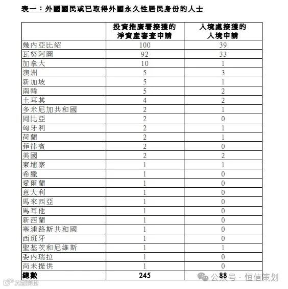 根据数据,提交申请的投资者中,以35岁至49岁年龄段为主。逾七成半的申请人士来自西非国家几内亚比绍及南太平洋岛国瓦努阿图,其中几内亚比绍有100宗,瓦努阿图有92宗。此外,加拿大占10宗,新加坡、澳洲及韩国则各有5宗。