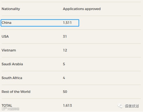 美国申请人为第二大申请群体,获批31份申请,其后依次是越南(12)、沙特阿拉伯(5)、南非(4),除此之外的其他国家共获批50份申请。