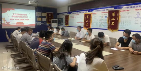 在安庆项目部“导师带徒”签约仪式上,青年导师代表分享了自己的工作经验和人生感悟,表达了对新员工的热烈欢迎。新员工们表示会脚踏实地,虚心求教,不断进步,把对成功的渴望转化为努力工作和学习的动力,用实际行动回馈企业、回报社会。