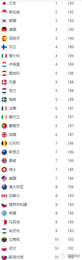 德国、西班牙则以190个免签及落地签国数量排在第三名。值得关注的是,第4-10名中的25个国家里,除了澳大利亚、新西兰、美国、加拿大,其余全部都是欧洲国家。