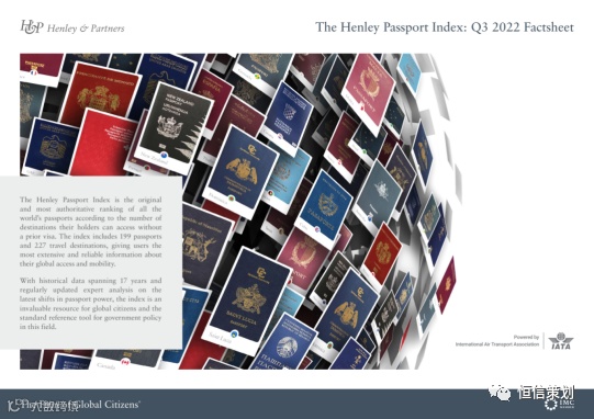 近日,亨氏护照指数(Henley & Partners Passport Index)根据各国和地区护照可免签或落地签目的地的数量,发布了2022年第三季度全球护照含金量排行榜护照排名,一起跟随我们一起看看最新的排名吧。