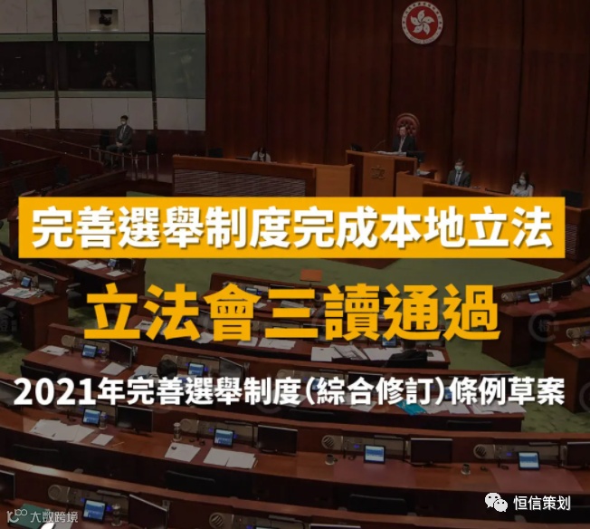 5月27日,香港立法会会议以40票赞成,2票反对,三读通过《2021年完善选举制度(综合修订)条例草案》。