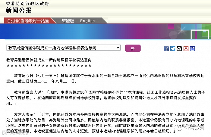 7月15日,香港特区政府教育局宣布,拟在天水围的一块全新土地上成立一所提供内地课程的非营利性私立学校,目标2025/26学年开始运作,提供不少于900个学额和12年小学及中学班级的内地课程,并邀请团体就此表达意向。