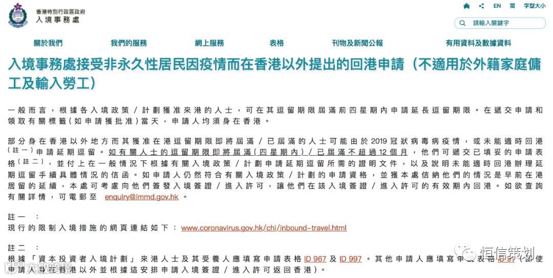 香港入境事务处(入境处)于2020年12月31日公布,因应新冠肺炎疫情,身在香港以外地方而其逗留期限即将届满或已届满的香港非永久性居民可申请入境签证或进入许可回港。