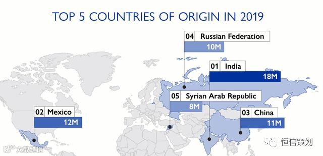 截至到2019年止,印度共输出1800万人,墨西哥输出1200万人,中国约1100万,俄罗斯约1000万,叙利亚约800万。