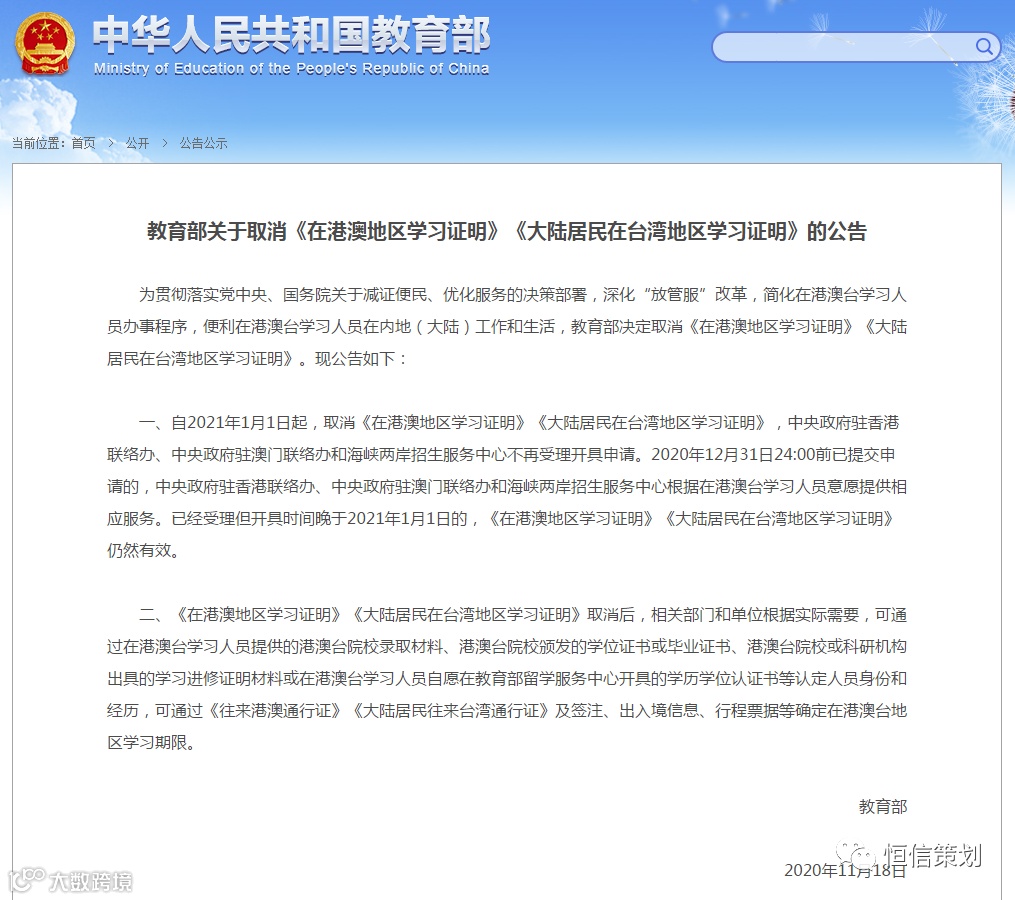 据教育部网站消息,国家教育部18日宣布,自2021年1月1日起起取消《在港澳地区学习证明》及《大陆居民在台湾地区学习证明》,未来学生可直接透过港、澳、台院校颁发的录取证明、学位证书,或是毕业证书确定身份及学历。