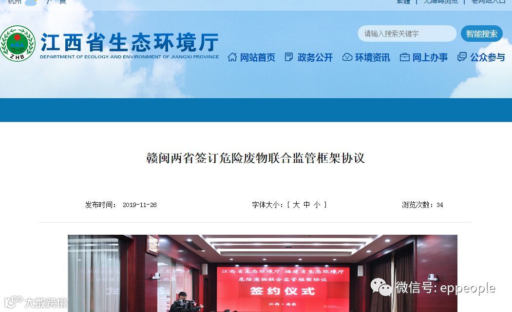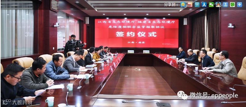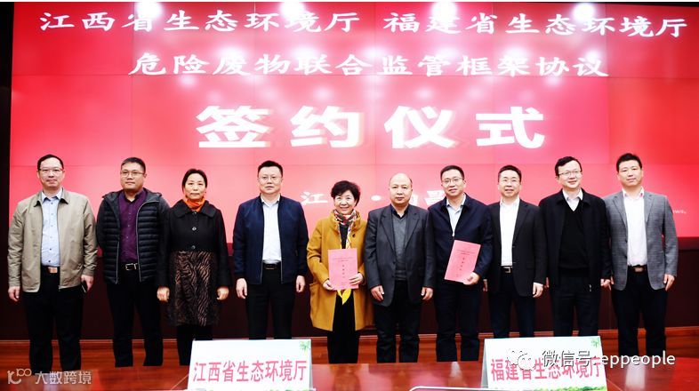 为进一步深化“放管服”改革,提升赣闽两省危险废物跨省转移环境风险协同防范能力,强化危险废物监管能力建设。11月25日,江西省生态环境厅石晶一级巡视员与福建省生态环境厅党组成员、总工程师郑彧签订赣闽两省签订危险废物联合监管框架协议。生态环境部高度重视,固体废物与化学品司周志强副司长专程莅临签约仪式并致辞。