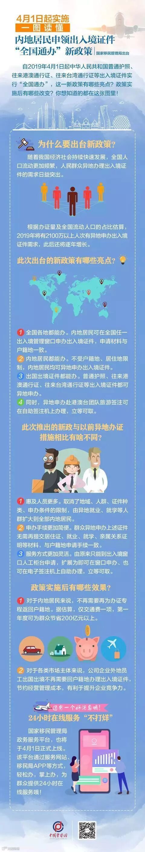 国家移民管理局2019年3月26日在京召开新闻发布会,通报自2019年4月1日起,中华人民共和国普通护照、往来港澳通行证、往来台湾通行证等出入境证件实行“全国通办”,即内地居民可在全国任一出入境管理窗口申请办理上述出入境证件,申办手续与户籍地一致。