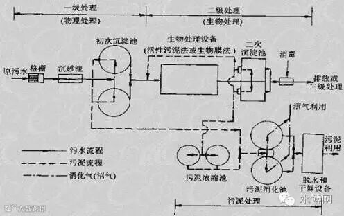 整个过程为通过粗格删的原污水经过污水提升泵提升后,经过格删或者筛率器,之后进入沉砂池,经过砂水分离的污水进入初次沉淀池,以上为一级处理(即物理处理),初沉池的出水进入生物处理设备,有活性污泥法和生物膜法,(其中活性污泥法的反应器有曝气池,氧化沟等,生物膜法包括生物滤池、生物转盘、生物接触氧化法和生物流化床),生物处理设备的出水进入二次沉淀池,二沉池的出水经过消毒排放或者进入三级处理,一级处理结束到此为二级处理,三级处理包括生物脱氮除磷法,混凝沉淀法,砂滤法,活性炭吸附法,离子交换法和电渗析法。二沉池的污泥一部分回流至初次沉淀池或者生物处理设备,一部分进入污泥浓缩池,之后进入污泥消化池,经过脱水和干燥设备后,污泥被最后利用。