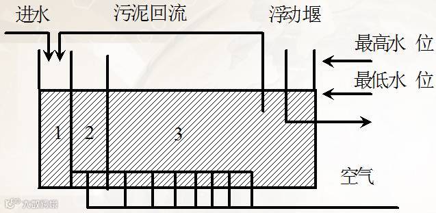 图1-7 CAST系统的反应池构造:l.选择器;2.厌氧区;3.主反应区