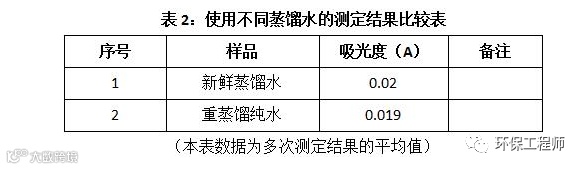 如用新鲜蒸馏水代替无氨水测氨氮,实验空白值和标准曲线与用无氨水时无显著差异,并具有较高的精密度和准确度。结果见表2。