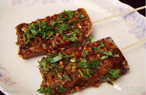 豬血糕;臺灣在臺灣,豬血糕是用木簽串起來的,像霜淇淋一樣。街市上非常普遍,常由豬血與大米做成。