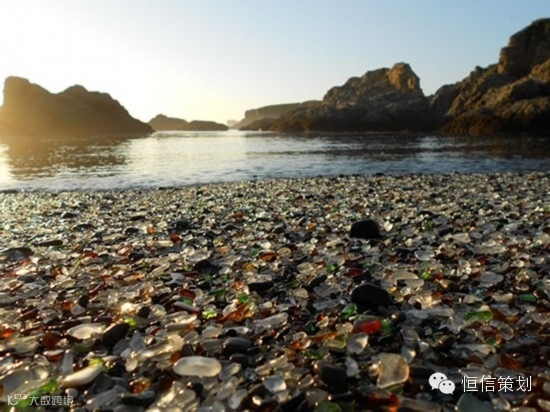 在美國加州的布拉格堡有這樣的海灘。這裡原本是丟垃圾的地方,但1960年代,居民們打算將垃圾回收清理時卻發現,埋在下面的很多垃圾,被大自然的力量改變成各種顏色的石頭,許多猶如玻璃般透亮!